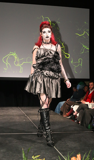 I revisited the dress two years later for a fashion show titled Petrichor and I made another dress to go with it using the same techniques, but this time I used black and gray fabrics and spikes to give an edgier look. Both looks were styled and makeup designed by myself.